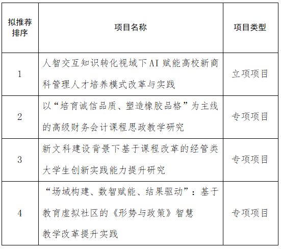 根据教务处《关于开展2025年度校级本科教学改革研究项目和专项项目申报及2024年度项目结题工作的通知》的相关要求,学院开展了2025年度校级教改项目立项申报推荐工作,经专家评审,推荐名单如下,公示期3天,反馈电话88958952。