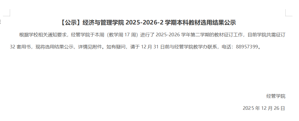 【公示】mg冰球突破豪华版网址2025-2026-2学期本科教材选用结果公示