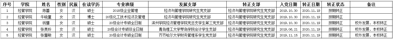 根据《中国共产党章程》和《中国共产党发展党员工作细则》及学校党委《关于发展学生党员工作的意见》(青科大党字〔2014〕77号)文件要求,mg冰球突破豪华版网址研究生党支部于2020年11月19日召开预备党员转正大会讨论陈蕾等5位同志的转正问题,同意以上同志按期转为中共正式党员,现将该5名同志情况予以公示。公示期为2020年11月19日至2020年11月25日。如有异议,请于公示期内到mg冰球突破豪华版网址党委反映。