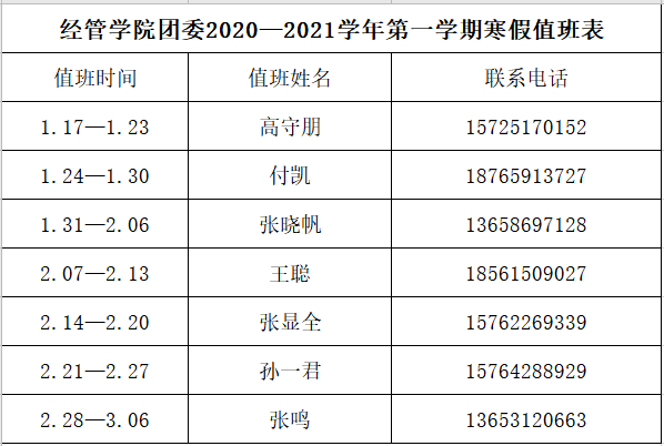 mg冰球突破豪华版网址团委2020—2021学年第一学期寒假值班表