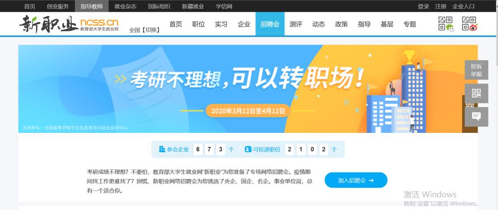 考研成绩不理想?不要怕,教育部大学生就业网“新职业”为您准备了专场网络招聘会。疫情期间找工作更难找了?别慌,新职业网络招聘会为您挑选了央企、国企、名企。事业单位岗,总有一个适合你。