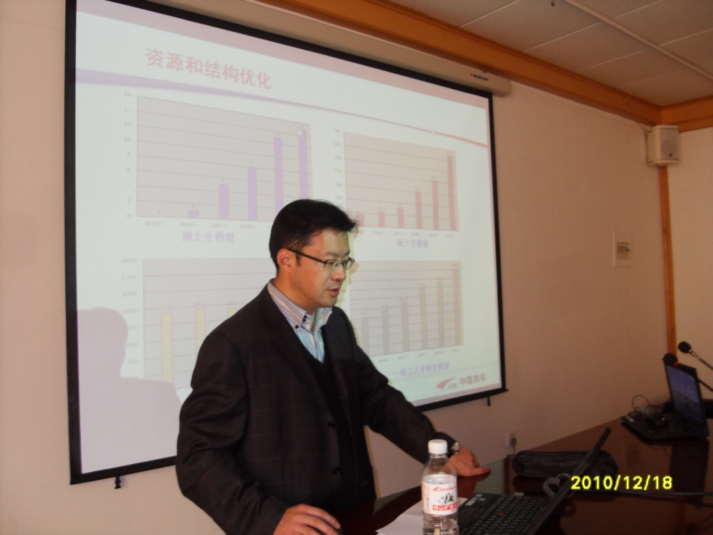 2010年12月18日上午,南车四方机车公司董事会秘书,企管部部长兰玉贞先生为mg冰球突破豪华版网址MBA学员带来一场别开生面的人力资源课程,题为:战略人力资源管理支撑“和谐号”动车组驶向高速。