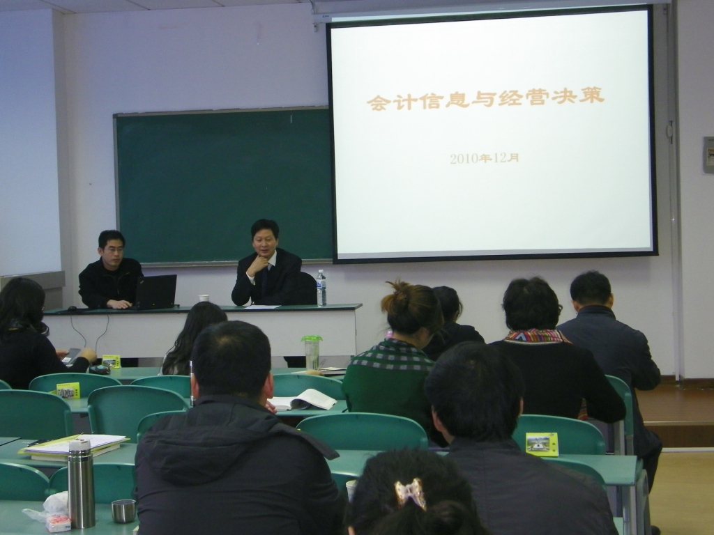 汤先生曾在山东大学管理学院任教,历任青岛海信电器股份有限公司总会计师、副总经理、总经理、海信集团有限公司总裁助理、副总裁、青岛海信空调有限公司总经理,现任青岛海信空调有限公司副董事长、青岛海信电器股份有限公司董事。他给大家讲述了会计信息的特点、会计信息与企业经营的关系以及如何利用好会计信息实施企业经营决策,多年的教学经历加上丰富的实践实验,使汤总的讲座语言睿智、资料翔实、逻辑紧密,从而最大程度的拓宽了同学们的视角和思维。