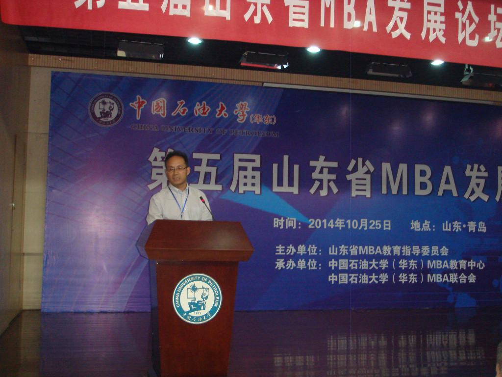 2014年10月25日,由山东省MBA教育指导委员会主办、中国石油大学(华东)MBA教育中心、MBA联合会承办的第五届山东省MBA发展论坛在黄岛成功举行。mg冰球突破豪华版网址MBA教育中心副主任李勋来、教师代表姜真、MBA办公室老师刘强、马燕、MBA联合会主席王德及2013级MBA班委成员赵峰、王荣刚参加了本次论坛。