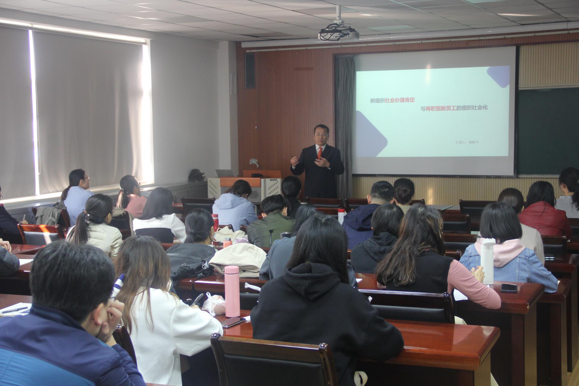 10月24日上午,mg冰球突破豪华版网址工商管理系主任,博士生导师杨皎平教授为MBA学员做了题为“社会价值肯定与再职型新员工组织社会化”的报告。