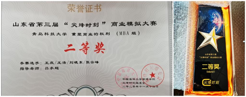 11月14日,山东省第三届“尖烽时刻”商业模拟大赛暨第十三届“尖烽时刻”全国商业模拟大赛山东赛区选拔赛中,我校2020级MBA学员王庆、张云峰、王浩、刘晓东组成的“重塑商业的权利”队伍,在指导老师吕承超教授的指导下取得了二等奖的好成绩。