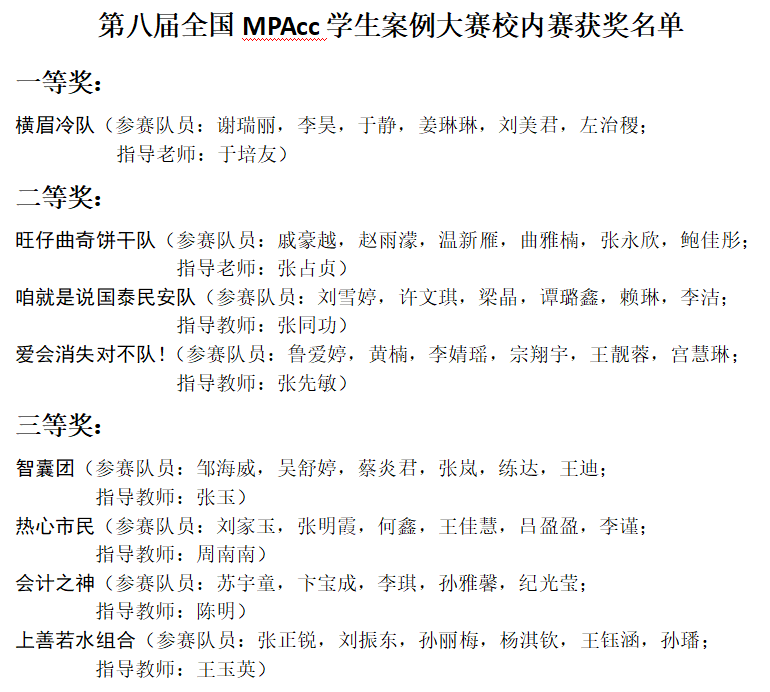 近日,MPAcc教育中心组织了2022年(第八届)MPAcc学生案例大赛校内赛,本次比赛的案例题目是“康美药业:一个不只是财务造假的故事”,我校共有19支队伍参加了校内比赛,有8支队伍脱颖而出,分别获得一二三等奖,这8支队伍获得授权,代表我校参加全国MPAcc学生案例大赛初赛。