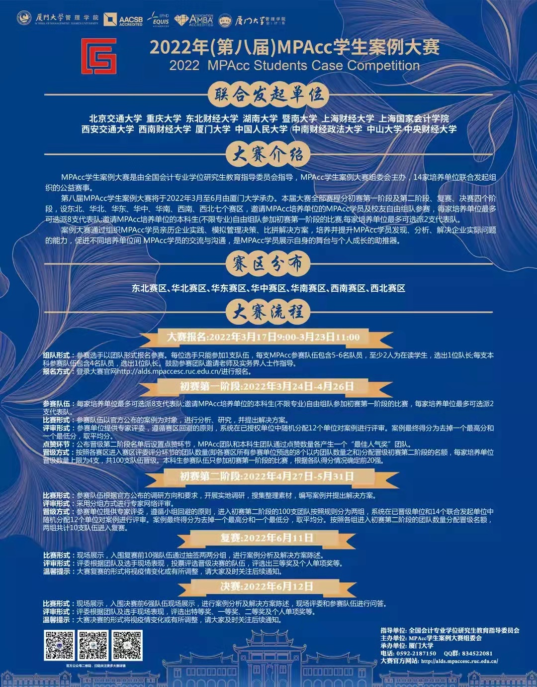 第八届案例大赛将于2022年3月至6月由厦门大学承办。本届大赛全部赛程分初赛第一阶段及第二阶段、复赛、决赛四个阶段,设东北、华北、华东、华中、华南、西南、西北七个赛区,邀请MPAcc培养单位的MPAcc学员及校友自由组队参赛,每家培养单位最多可选派8支代表队。