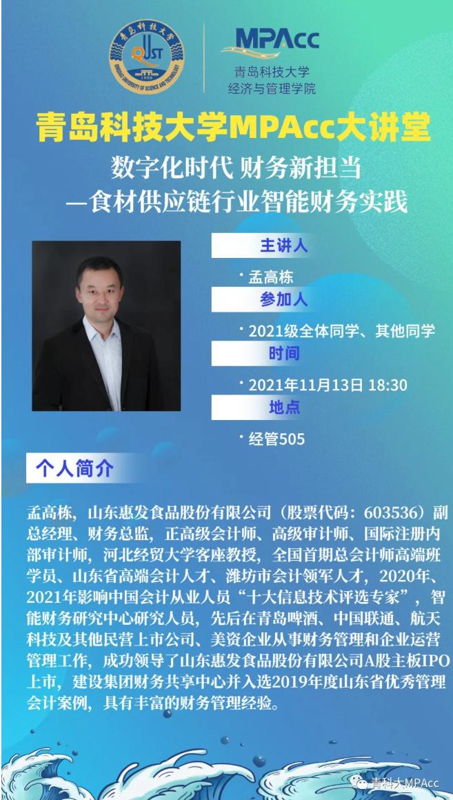 11月13日晚,山东惠发食品股份有限公司副总经理、财务总监,正高级会计师,山东省高端会计人才,冰球官网校外导师孟高栋莅临mg冰球突破豪华版网址,举办了“数字化时代 财务新担当-食材供应链行业智能财务实践”的主题讲座,报告会由MPAcc教育中心主任于培友老师主持,冰球官网2021级会计硕士聆听了此次报告。讲座围绕数字化时代智能财务创新与实践应用展开。