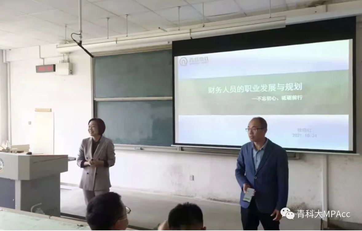2021年10月24日上午,青岛地铁集团公司副总会计师、青岛地铁金融控股公司董事长、青岛地铁商贸公司董事长、我校会计硕士校外导师徐晓红女士莅临mg冰球突破豪华版网址,为2021级会计专硕研究生举办了题为《财务人员的职业发展与规划》的主题讲座,报告会由MPAcc教育中心主任于培友老师主持,冰球官网2021级会计专硕研究生聆听了此次讲座。讲座围绕财务人员发展阶段及未来前景等方面展开。